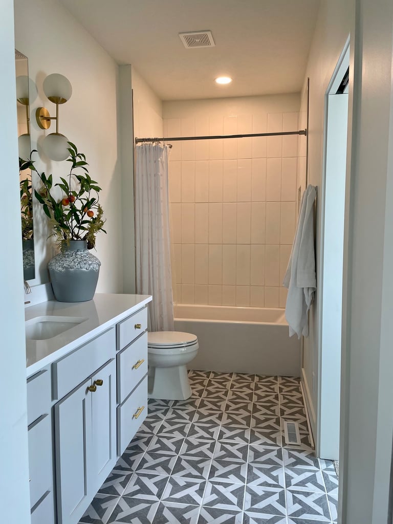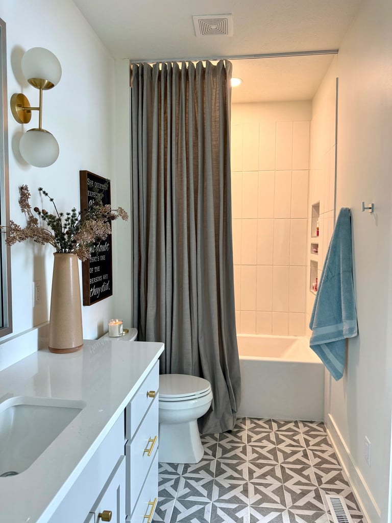 What a difference this made. Using a floor to ceiling custom curtain made the bathtub/shower combo appear elegant and high end.