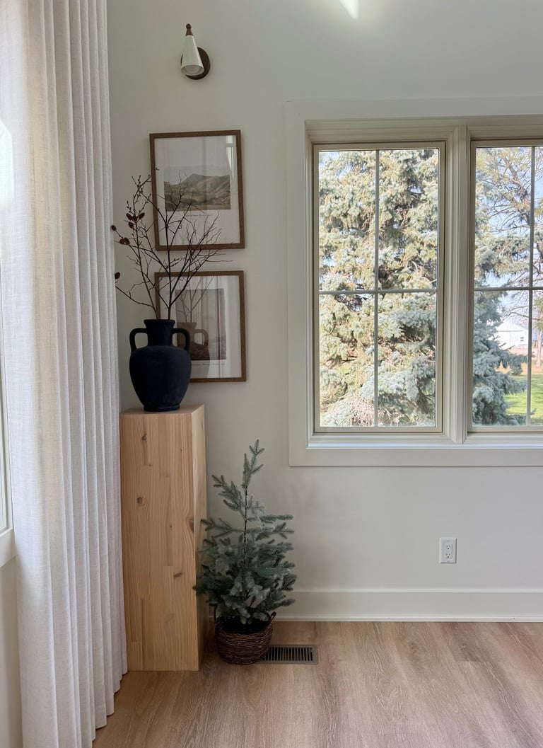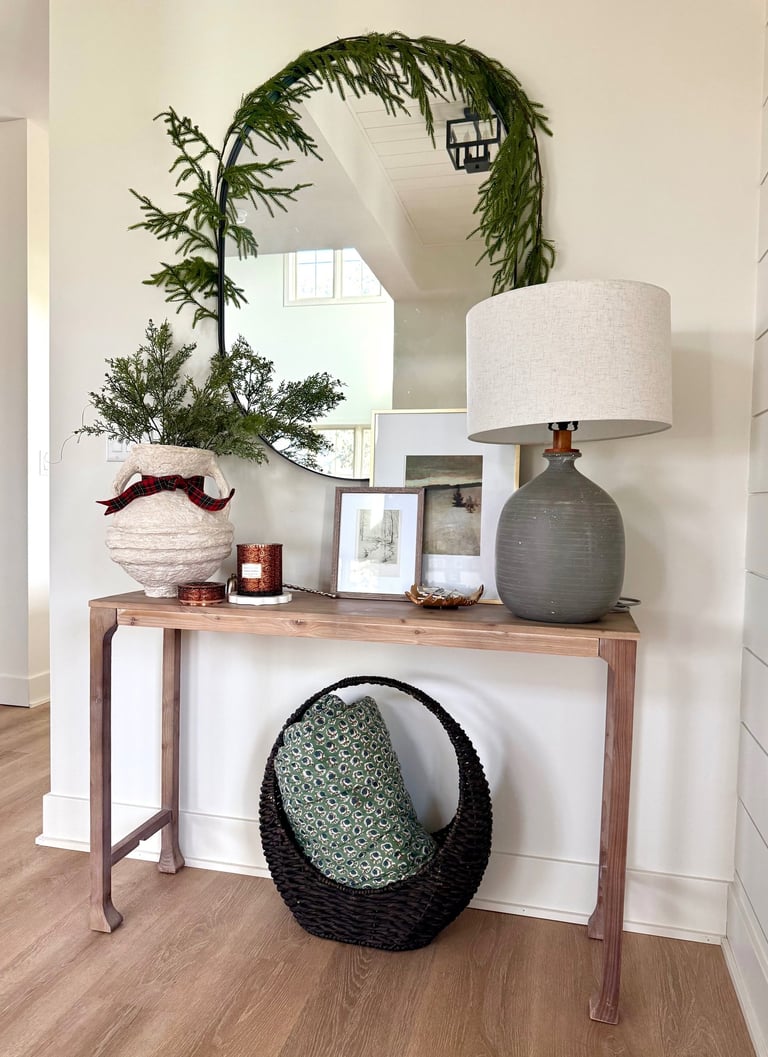 The entry way is just simple greenery. I also keep the same frames but just switch them out with winter art. And, of course, I light the candle. I also have all our lamps on timers to turn on at 5pm to 10pm. We use the app: Kasa to control the lamps and tree lights. That makes it easy to enjoy all the soft lights.