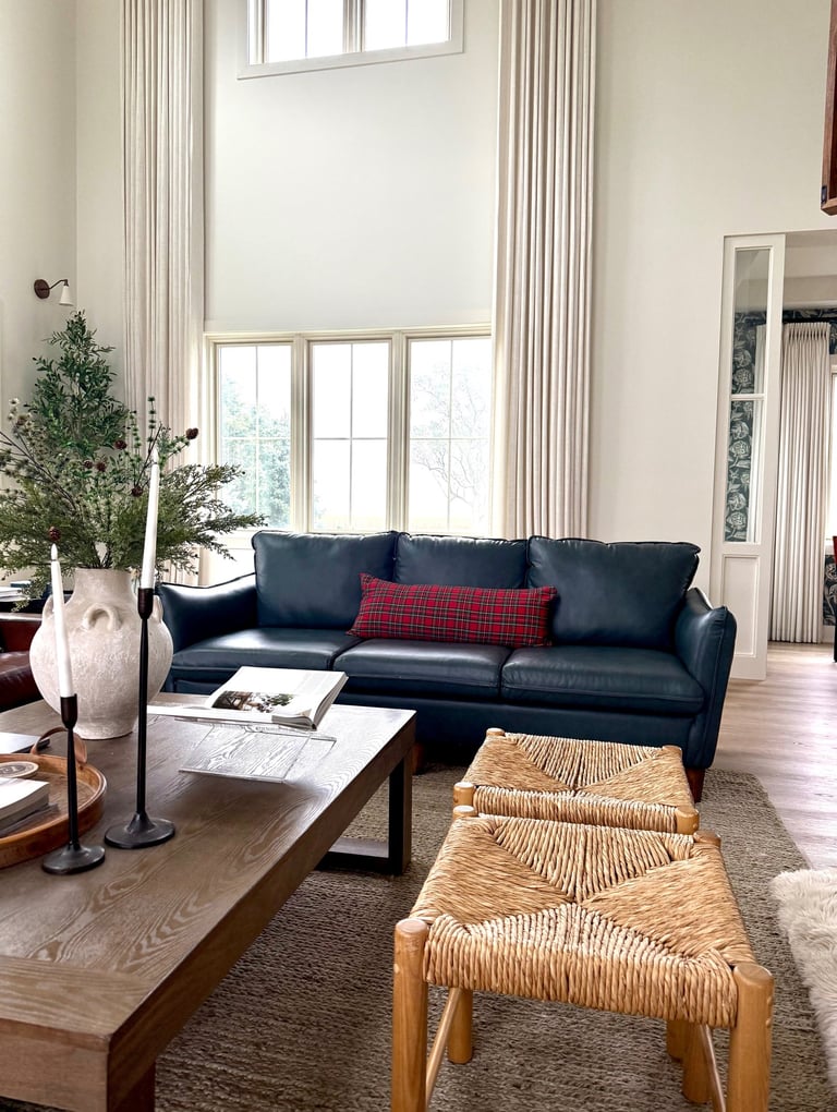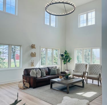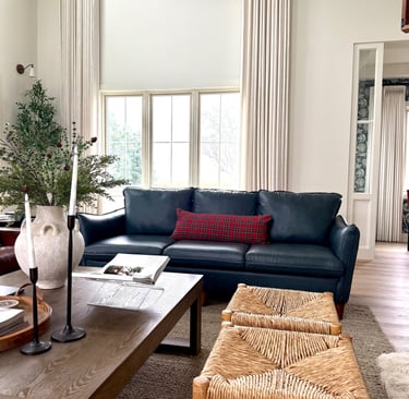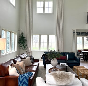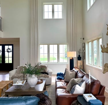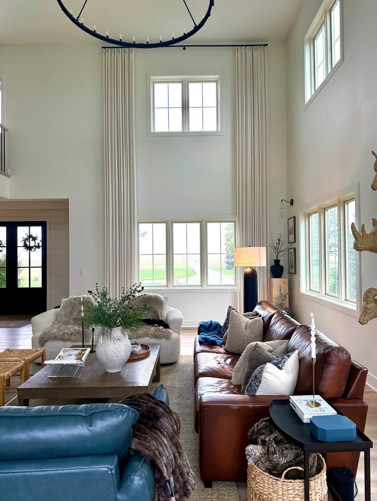 This great room has really transformed into an inviting space, but it has taken years. We have saved a budgeted and couldn't just buy new furniture to fit the space. We moved in with what we had at the previous home. I will show how the room has progressed. The newest and biggest transformation has been the addition of two story curtains. I worked with Lux Drapes to have them custom made for the east and west facing windows. They turned out better than I could have imagined.