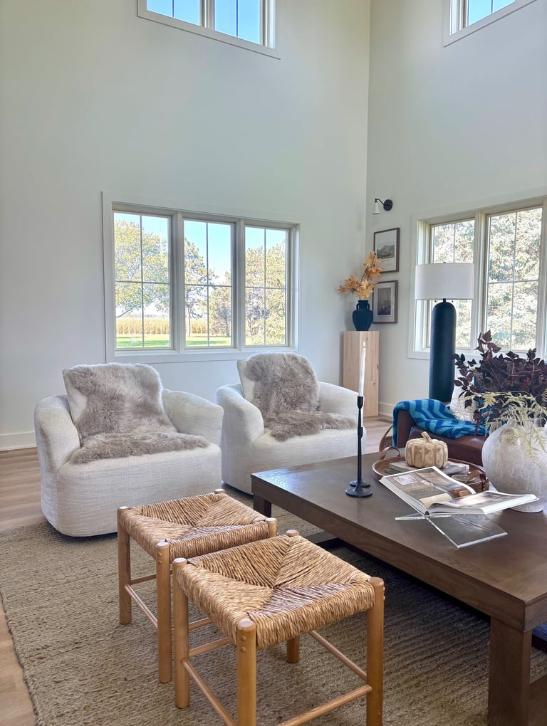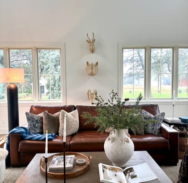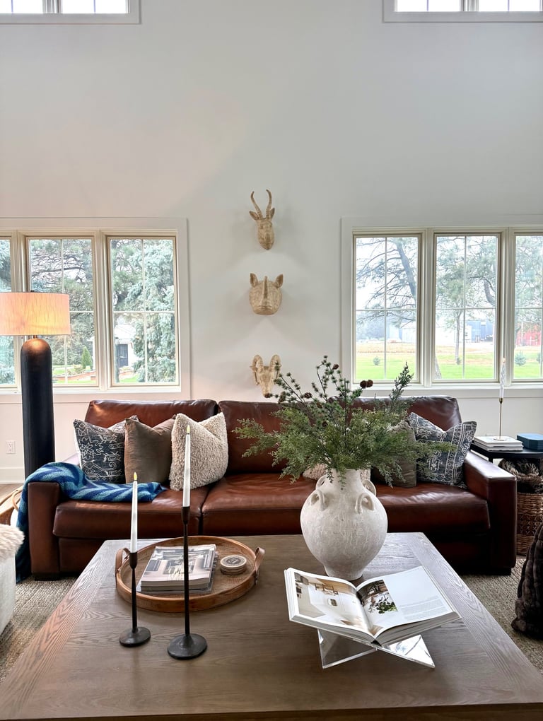 We then added the blue couch. It was upstairs in the office but thought we might use it more down here and use this space more. Next up was adding a tv. It is hidden and looks more like art work above the fireplace. A month or so ago we switched out my Facebook marketplace Restoration Hardware chairs for swivel chairs from Amazon. The chairs are $200 and we love them. We all use these chairs more. I added Overland Sheepskin pelts to the chairs for winter and to make them even more comfortable and cozy.