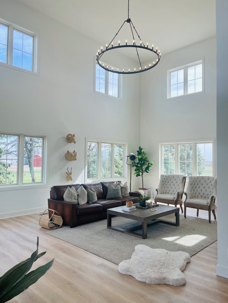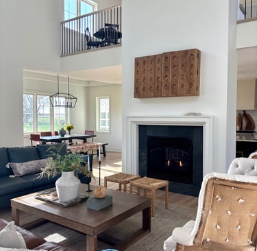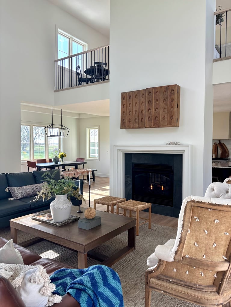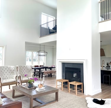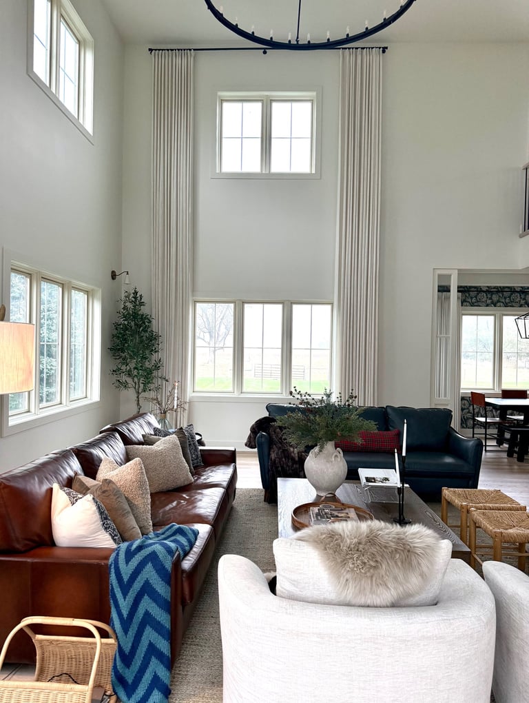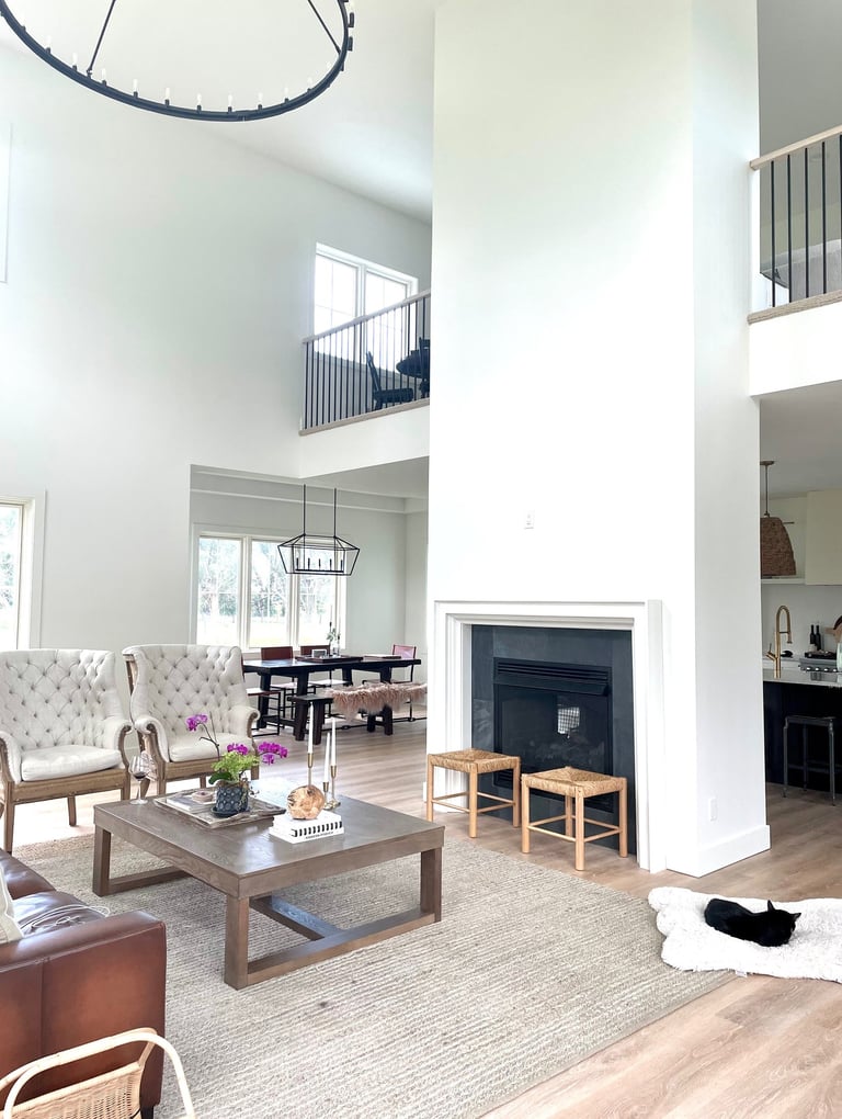 These last four images are where we are at today! Don't the two story curtains make it so high end? I feel it now holds up to its name: the great room. And more importantly, this has become the space we now hang out in the most. The curtains are Lux Drapes and I have a code: EDEN for 27% off site wide!! The curtains I chose were Florence Linen Blend Pleated in Ivory White. They are all my dreams come true. I will link everything at the bottom. We did buy extra strong curtain rods to hold the weight of these heavy curtains. Next up is the fireplace. It is two stories and needs a statement. If you have any affordable ideas for the two story fireplace, send them my way.